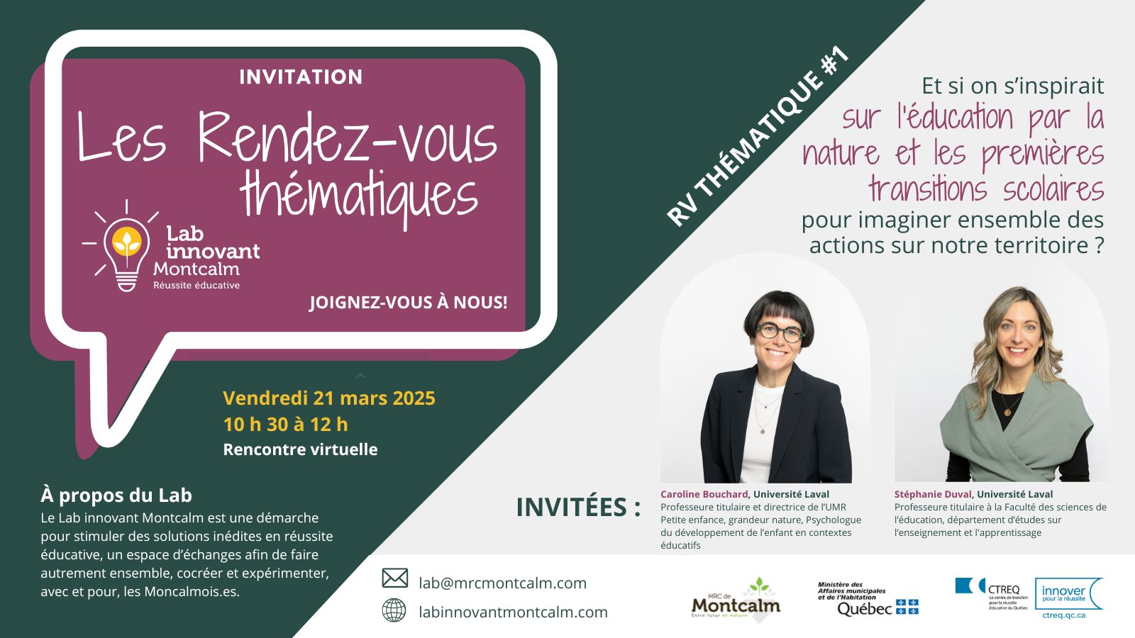 La Municipalité régionale de comté (MRC) de Montcalm et ses partenaires ont offert une conférence double dans le cadre des Rendez-vous thématiques de leur projet de laboratoire d’innovation en réussite éducative. Pour offrir une synthèse de la conférence de Caroline Bouchard et Stéphanie Duval, la MRC de Montcalm a retenu l’illustration graphique, voyez l’infographie.